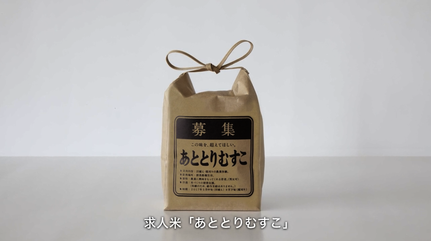 The staple food of Japan: rice. However, in recent years the number of people involved in agriculture has declined and Japan’s population is increasingly aging, causing the search for successors of rice farmers to become a big issue. One of the farmers having trouble finding a successor, Hatsuo Endo (65 years old) of Kiryu City, Gunma Prefecture, designed a unique advertising strategy to recruit young people interested in agriculture. Along with an NPO corporation in Gunma Prefecture, we launched the rice "Atotori-Musuko" which helped advertise agricultural jobs, straight on the package. Not only is it an advertisement for jobs, but purchasing "Atotori-Musuko" allows the buyer to participate in an agricultural experience.