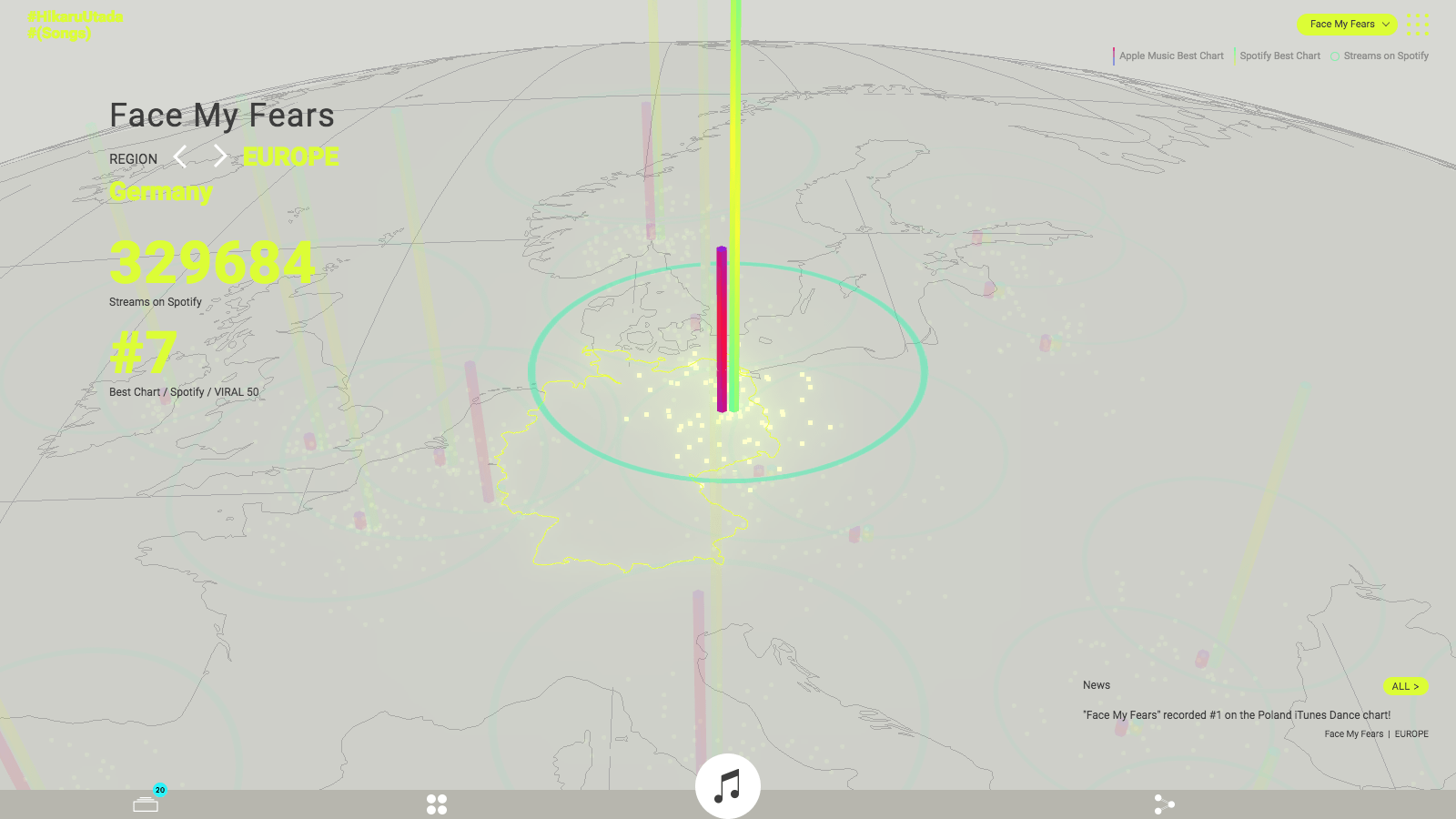 During the developmental process, we aimed to prevent the website from being heavy due to the visualization of global trends and buzz surrounding the song. We put effort in creating the touch sensation of the interface and animation in a way the user would want to continue interacting with the webpage. Especially the mapping on the globe which is a core part of the interaction is something we repeatedly prototyped and tested. Although the initial implementation plan was to develop by using