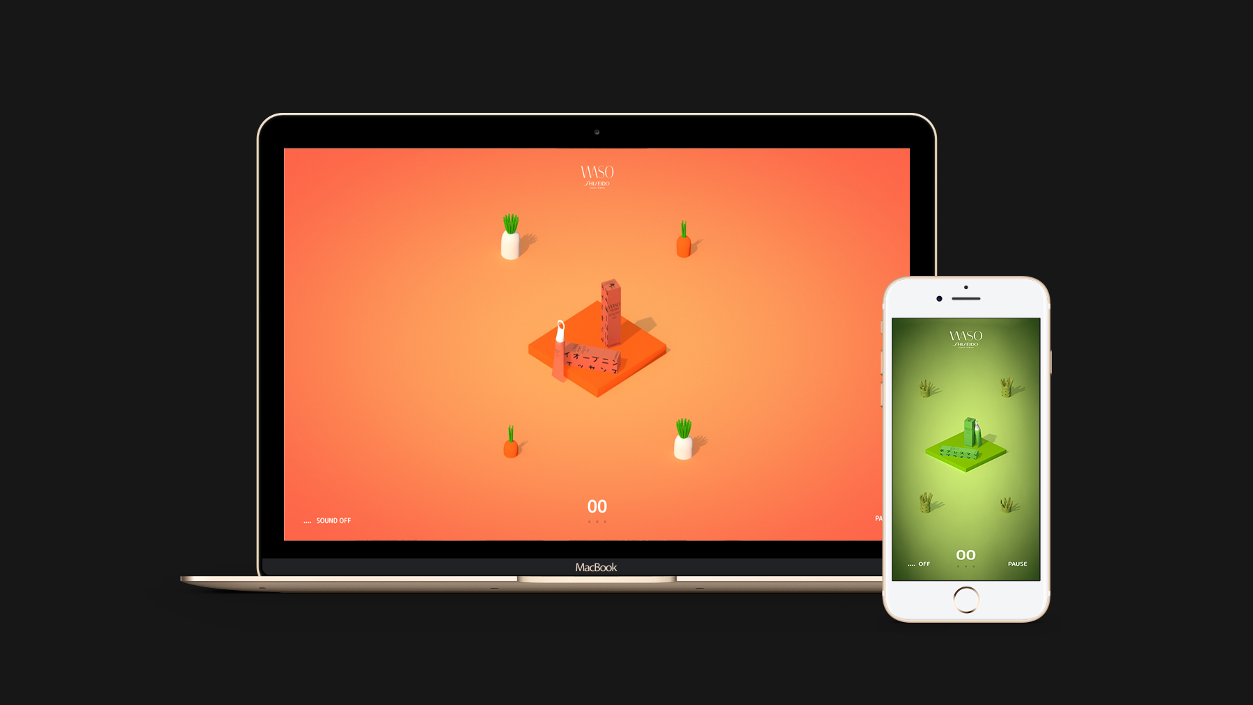 Shiseido tasked us to create a web-based game to support the promotion of the campaign film for the WASO AW2019 collection. The brief was clear: design a simple, clean and elegant game that would invite players to discover the origin of the products and bring them closer to the Japanese philosophy of Washoku, the harmony with food which is the core aspect of all WASO products. Composed of 4 levels, the game asks the player to toss the ring around carrots, daikon, wasabi and honey dipper to reveal each of the four products of the new collection.