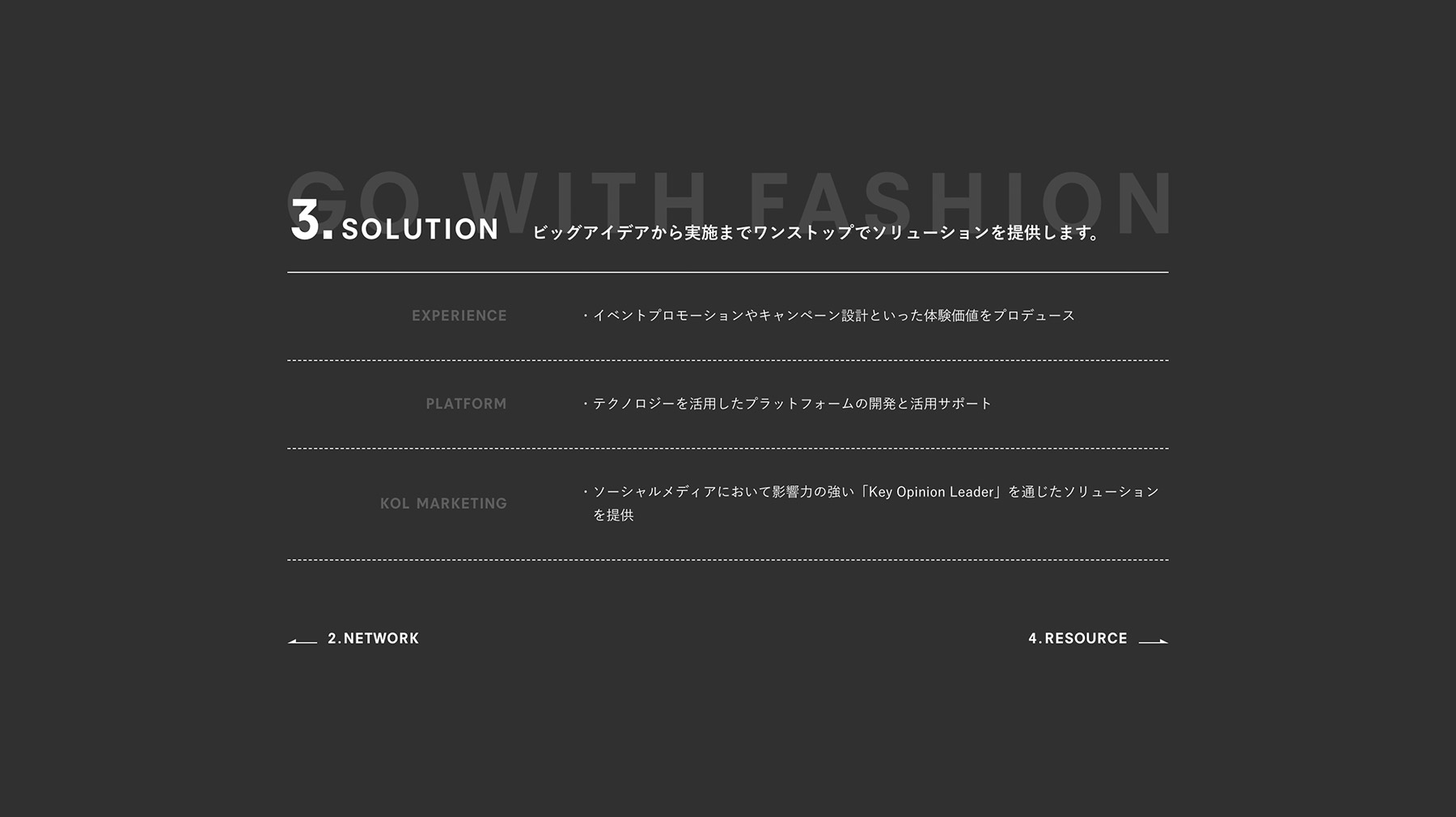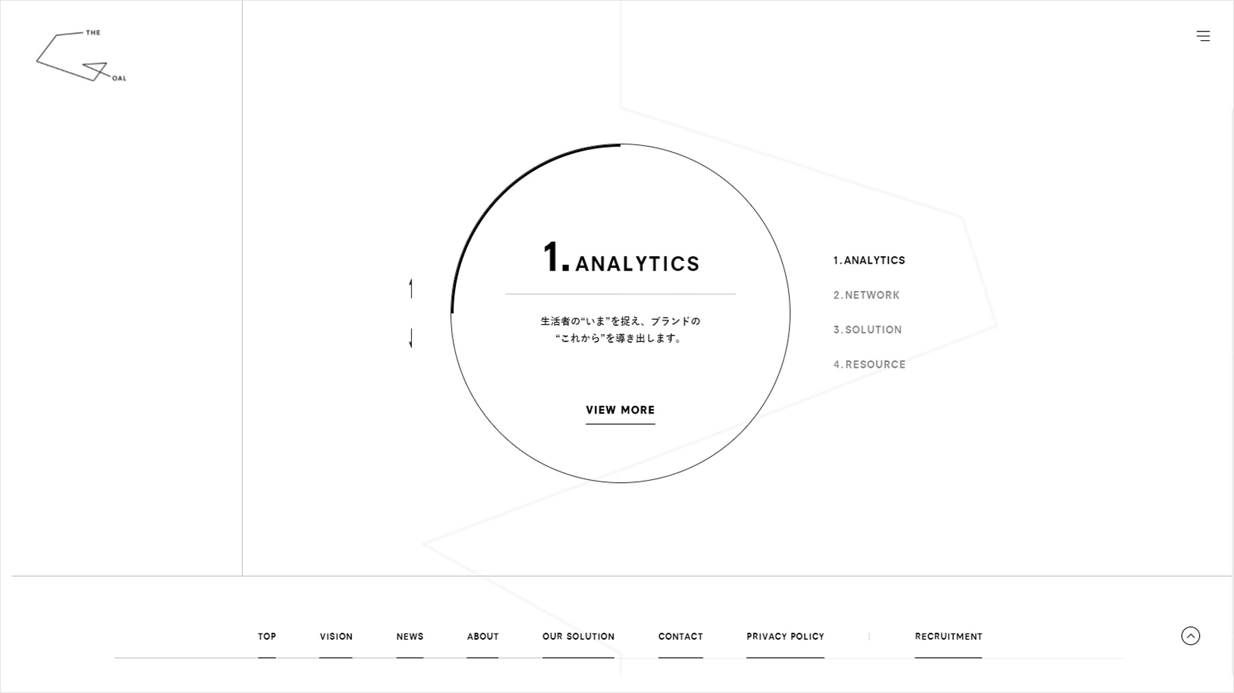 “We want to solve problems in the world with the power of fashion.” This is what the members of THE GOAL hold in their hearts. Based on their logo and corporate vision “GO WITH FASHION”, we produced their website to show in the simplest way what kind of company “THE GOAL” is.