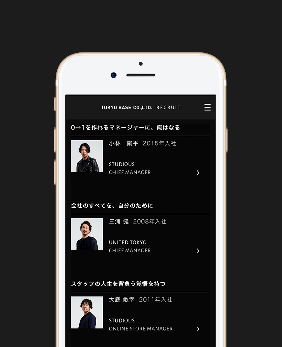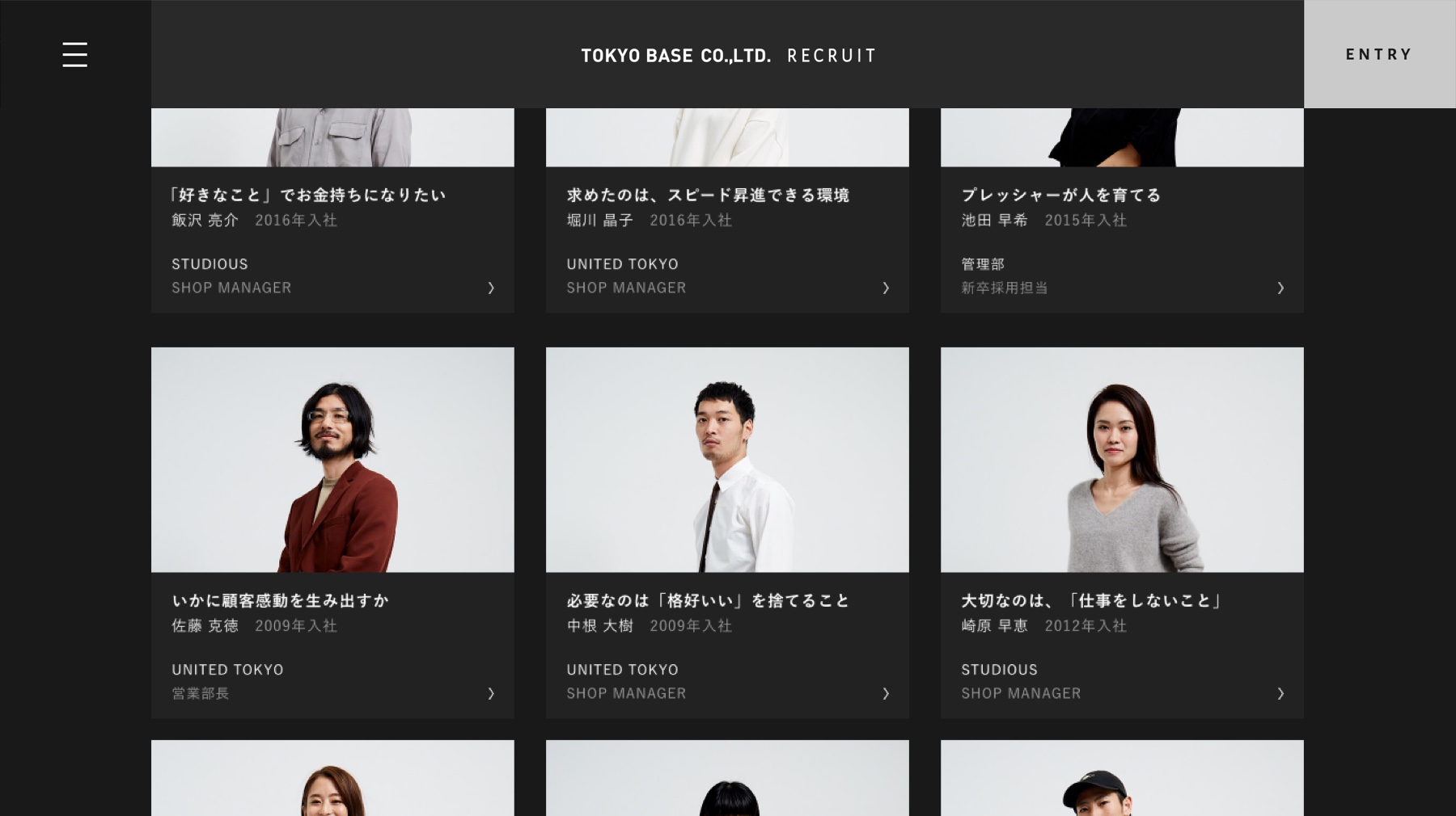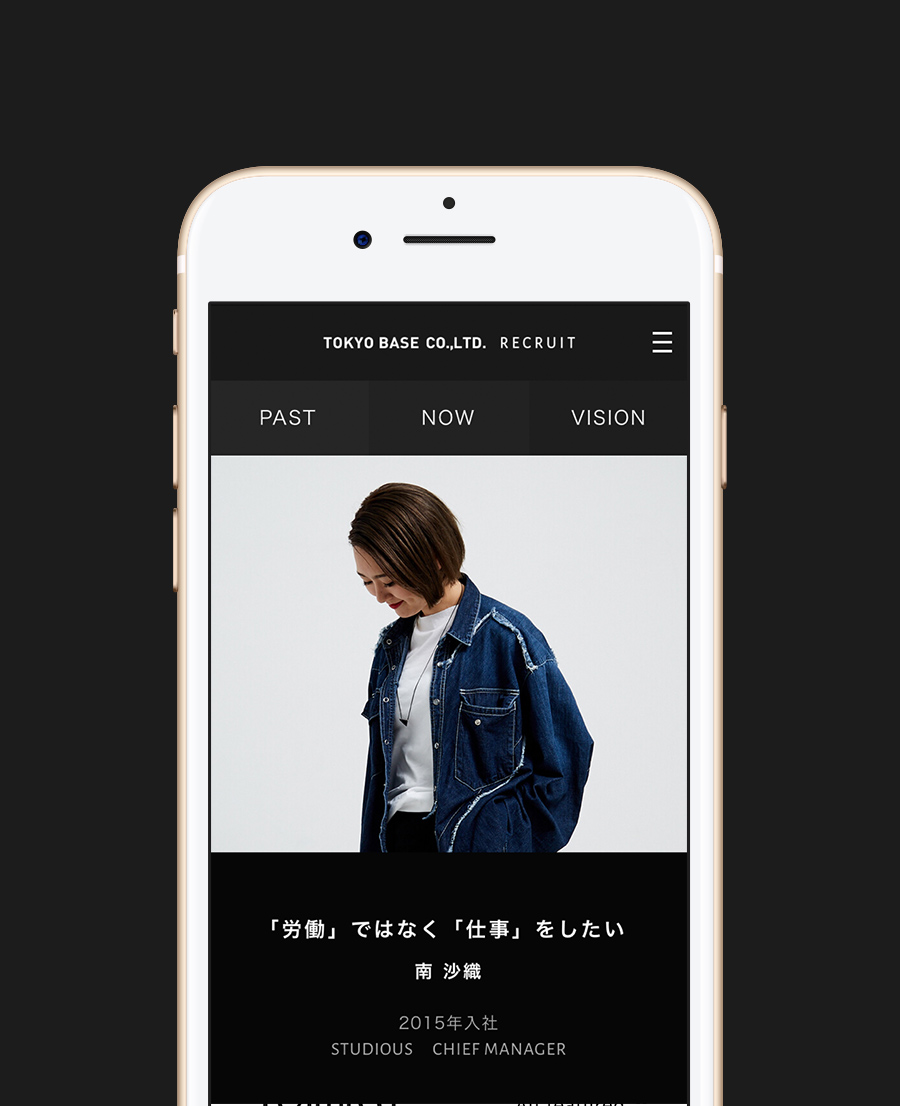 Following this vision, we also created the recruitment website which tells TOKYO BASE’s stories from past to future and staff stories which shows their philosophy “to respect individuals”. More than a recruitment website, this is also the opportunity to share their vision and attitude to trust employee’s power and passion.